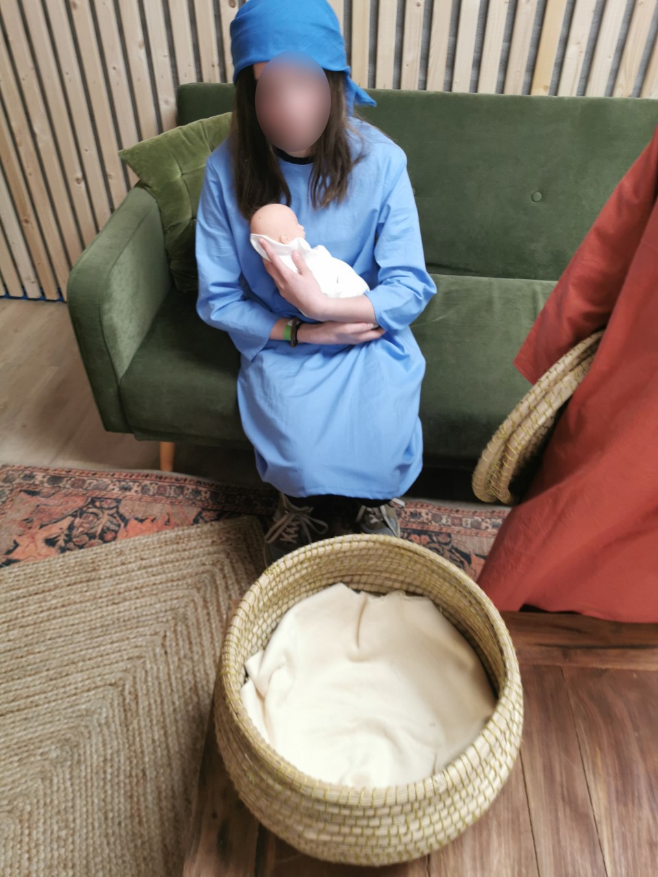 La maman (Jokébed) : (s'adressant à Myriam et Aaron) Il ne faut pas que les gens sachent que notre bébé est avec nous ! Sinon les soldats égyptiens vont venir le chercher et le jeter dans la rivière et il va mourir ! On va le garder ici dans la maison !