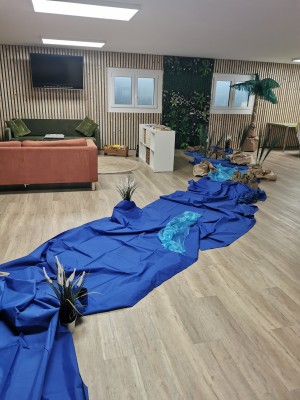 - Placez le décor : la maison de Moïse d'un côté, le Nil (avec des tissus bleus), de l'autre.