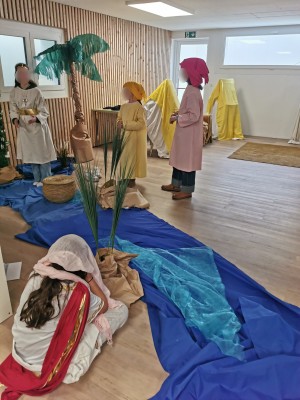 - Placez le décor : la maison de Moïse d'un côté, le Nil (avec des tissus bleus), de l'autre.