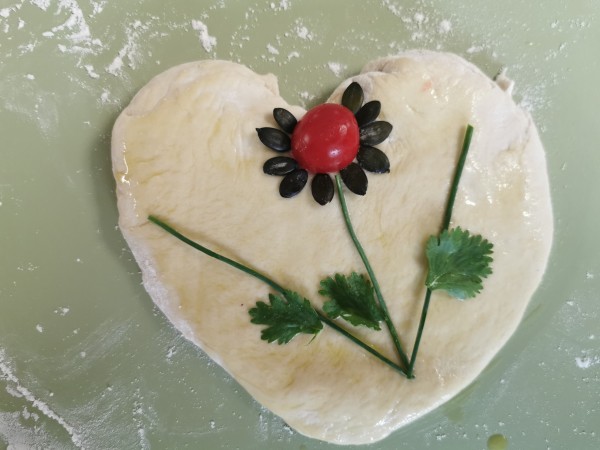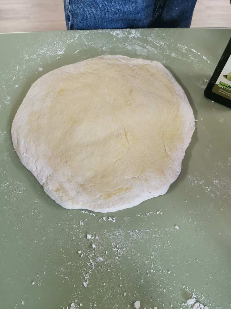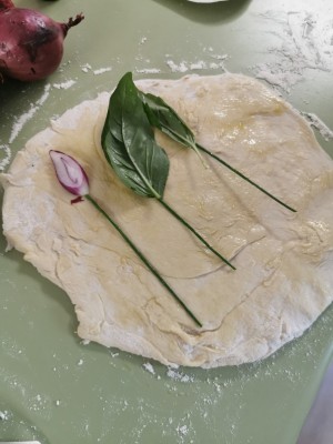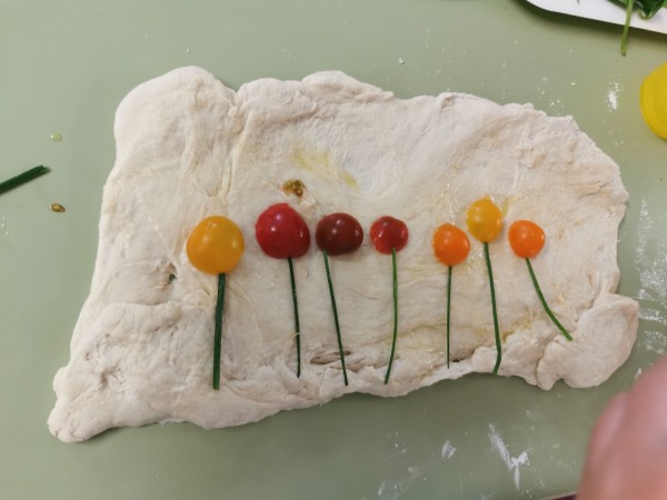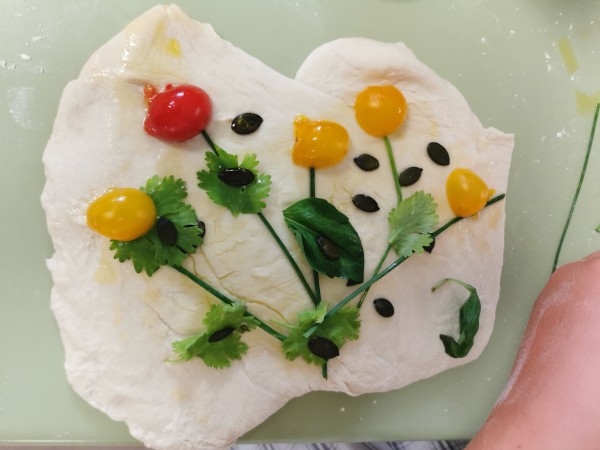 Une focaccia en forme de jardin (préparez la pâte la veille et la laisser doubler de volume dans un grand sac plastique fermé toute la nuit).