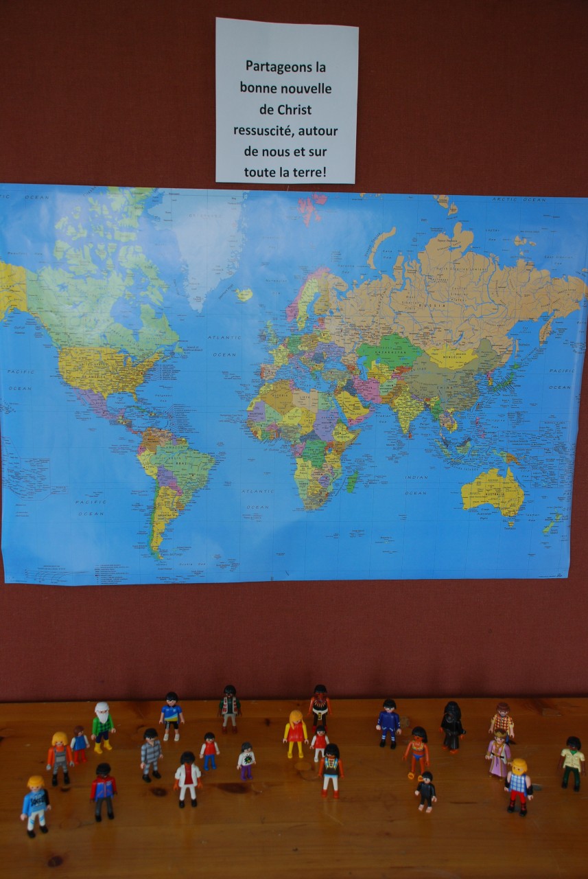 Prenez des Playmobil contemporains et sur une carte mondiale étalée, mettez les Playmobil sur beaucoup de pays différents.