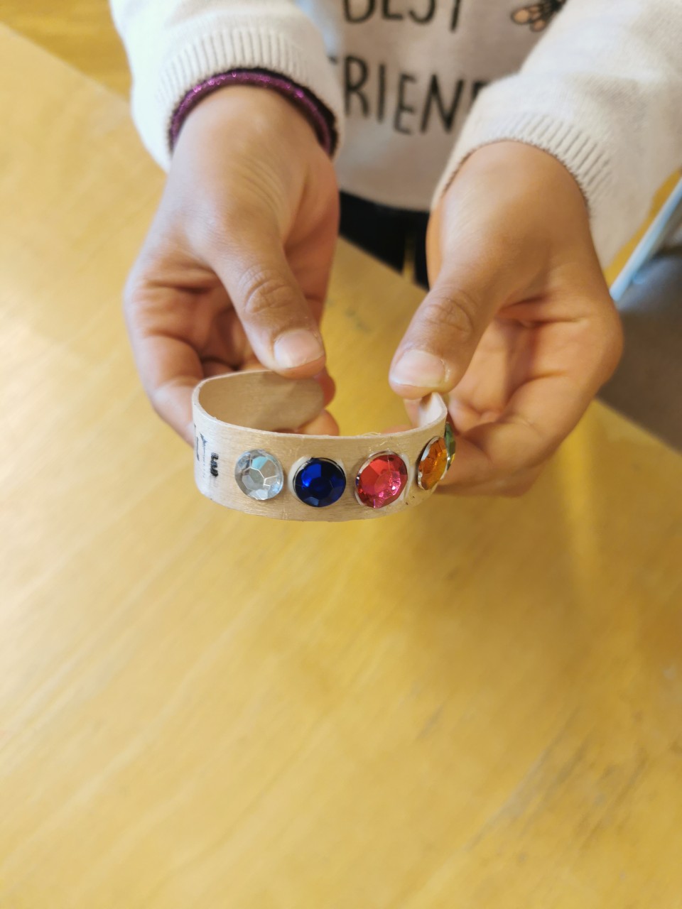 - Places des rubans adhésifs sur le bracelet, des strass selon ton inspiration ou des fils de laine enroulés autour.